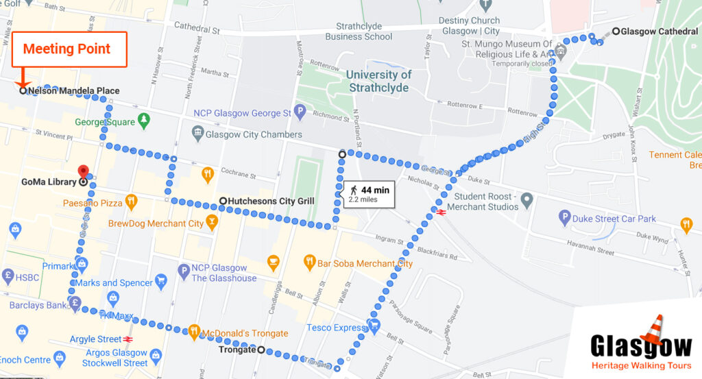 The tour starts at Starbucks Nelson Mandela Place, then George Square, The Merchant City, Glasgow Cathedral, The site of the Original Glasgow University, Trongate and finishes at the GOMA by the infamous Glasgow Hat.